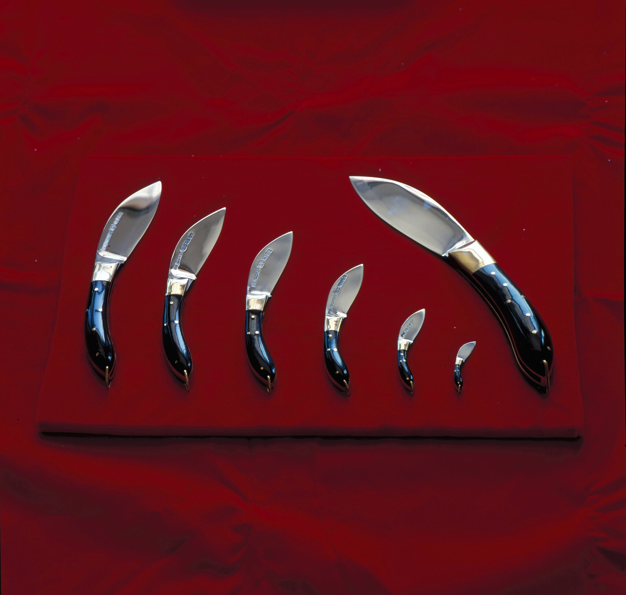 (1) A complete set of Shihlin knives in various sizes displayed to advantage against a background of red velvet cloth. (2) Chiu Chien-chin, the old master of the Shihlin Custom Cutlery Corporation is still in good health, though he is now nearly 70 years old. He says that he is reluctant to leave his work for even a day. (3) With some 30 years experience in the cutlery industry, Chiu Hsien-yao will inherit the business.