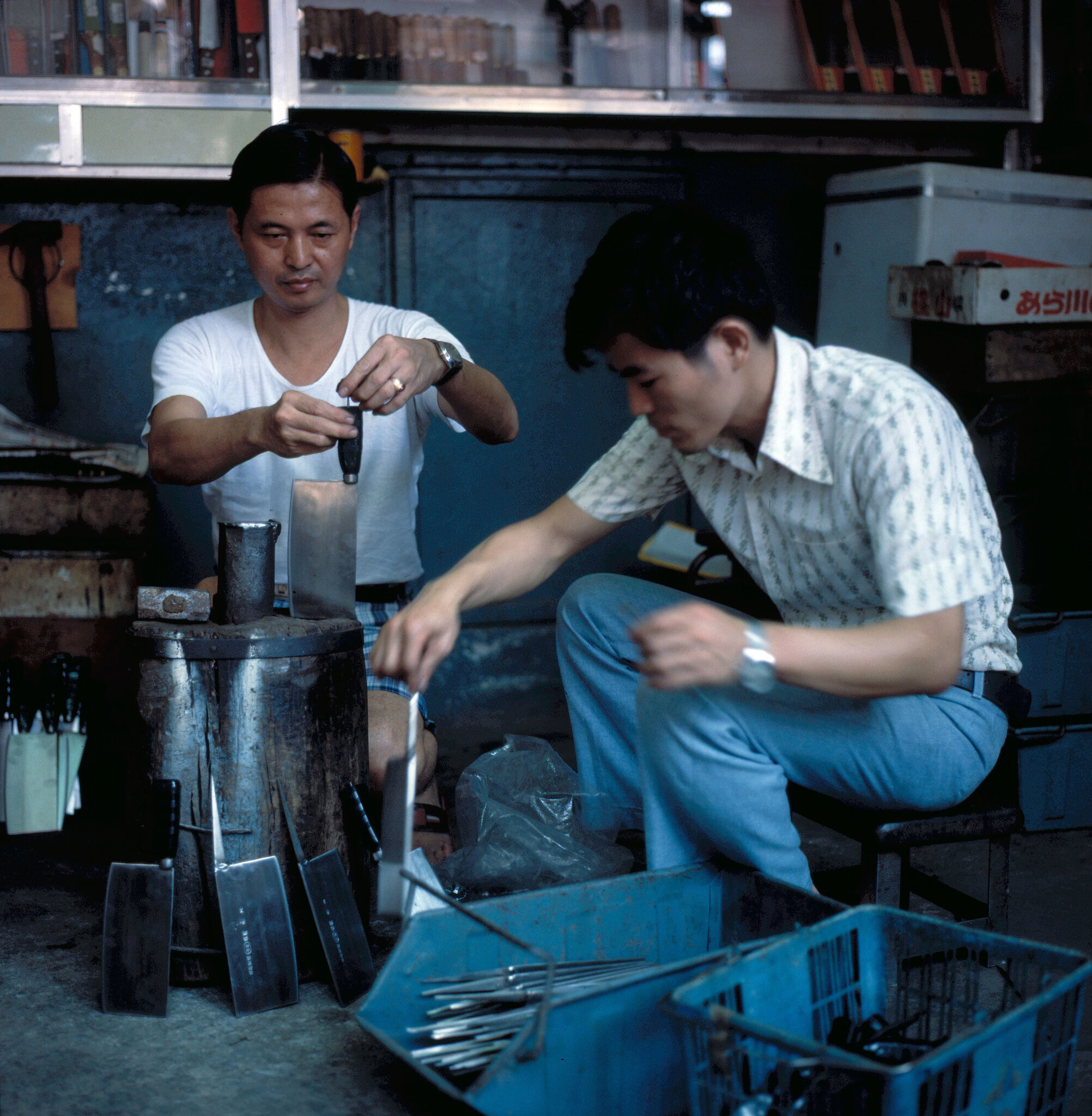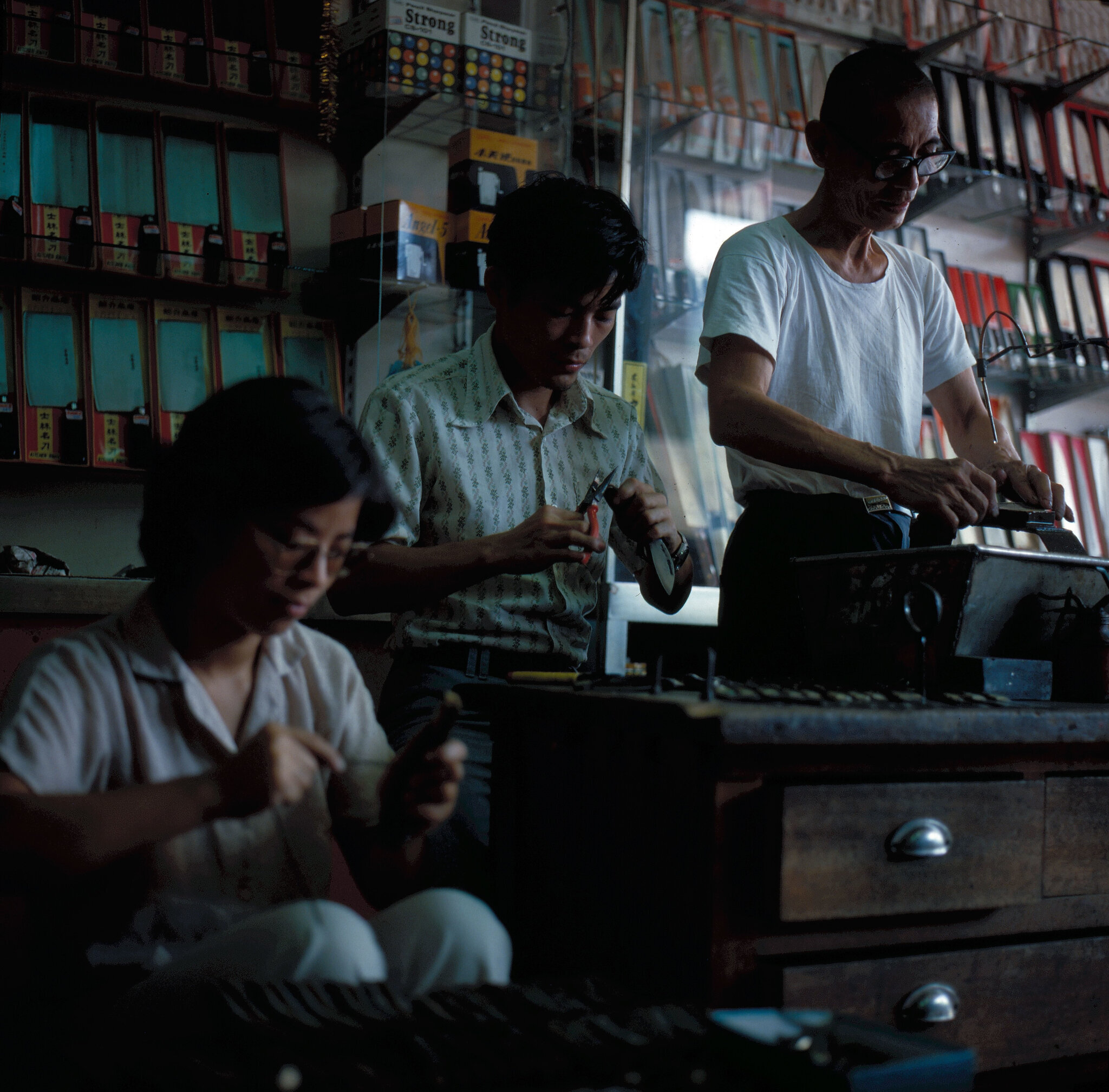 Left: Chiu's shop offers a wide range of knives, each shaped and suited to its purpose over years of refinement. Right: Two generations of Chiu's family at work.