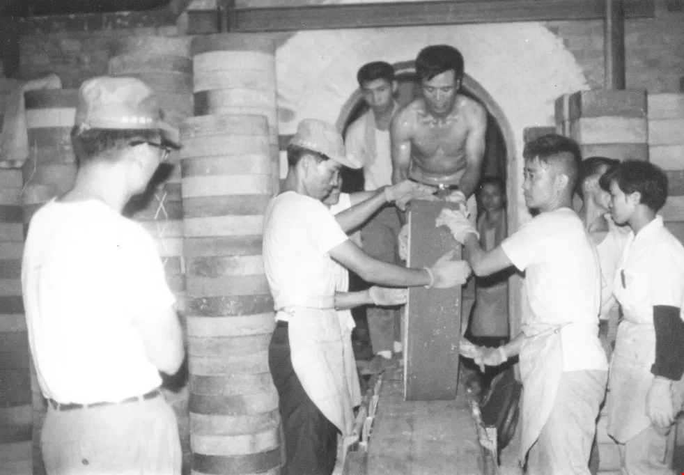 An early photo of a grinding wheel coming out of a kiln, back when Kinik was still known as China Grinding Wheel. (courtesy of Kinik)