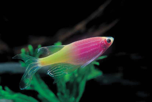 The fluorescent fish was named one of the world's coolest inventions of 2003. Under blue light, the body of the fluorescent fish gives off an impressive red and green glow