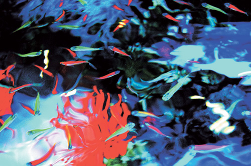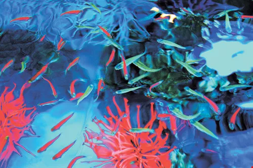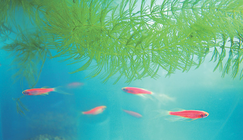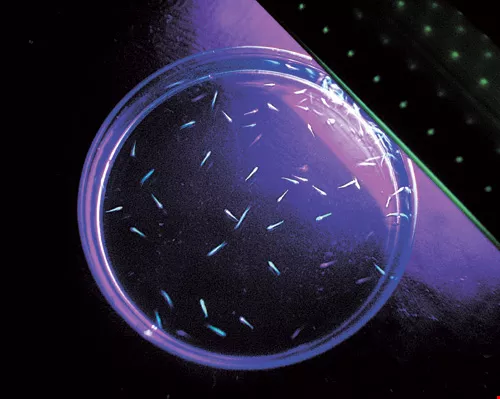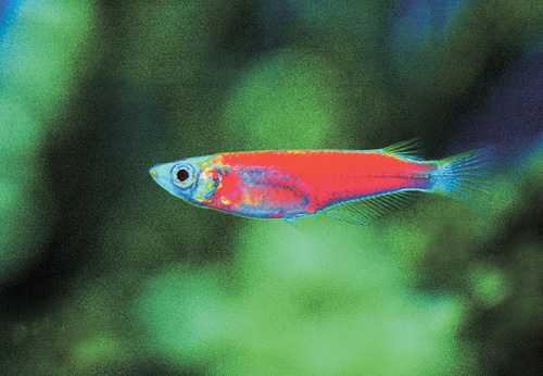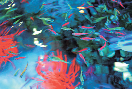 Black or blue light of wavelengths between 350 and 400 nanometers (commonly used in detecting counterfeit bills or for lighting effects in nightspots) excites phosphorescent proteins in the genetically modified zebra fish, a docile variety with beautiful stripes, and big-bellied medaka. The small fish, measuring just three centimeters in length, swim about the aquarium, emitting a spectrum of strange colors, like a rainbow flashing in a night sky. The effect is not only spectacular, but full of mystery.