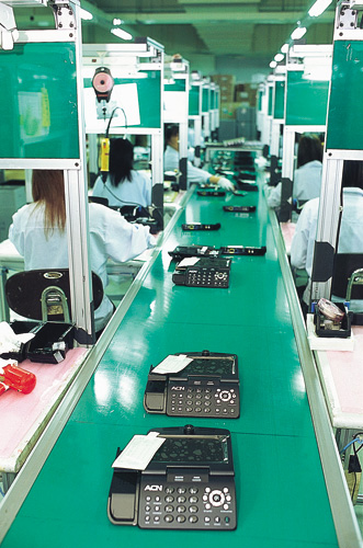 Universal Microelectronics kept its high-value-added and customized production in Taiwan when it relocated its low-margin production to mainland China. It's a model often followed by Taiwanese firms with a cross-strait division of labor. The photo shows UMEC's Taiwan-based videophone production line, the world's largest.