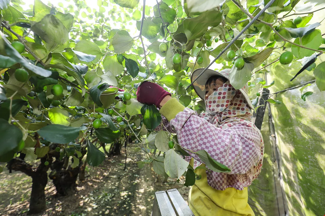 The tall Su strolls through a grove of low fruit trees, undaunted by their thorns. As he prunes, he explains: “This is the third round of fruit thinning.” Small jujubes culled from the branches cover the ground, indicating that diligent fruit thinning is the key to an abundant harvest.