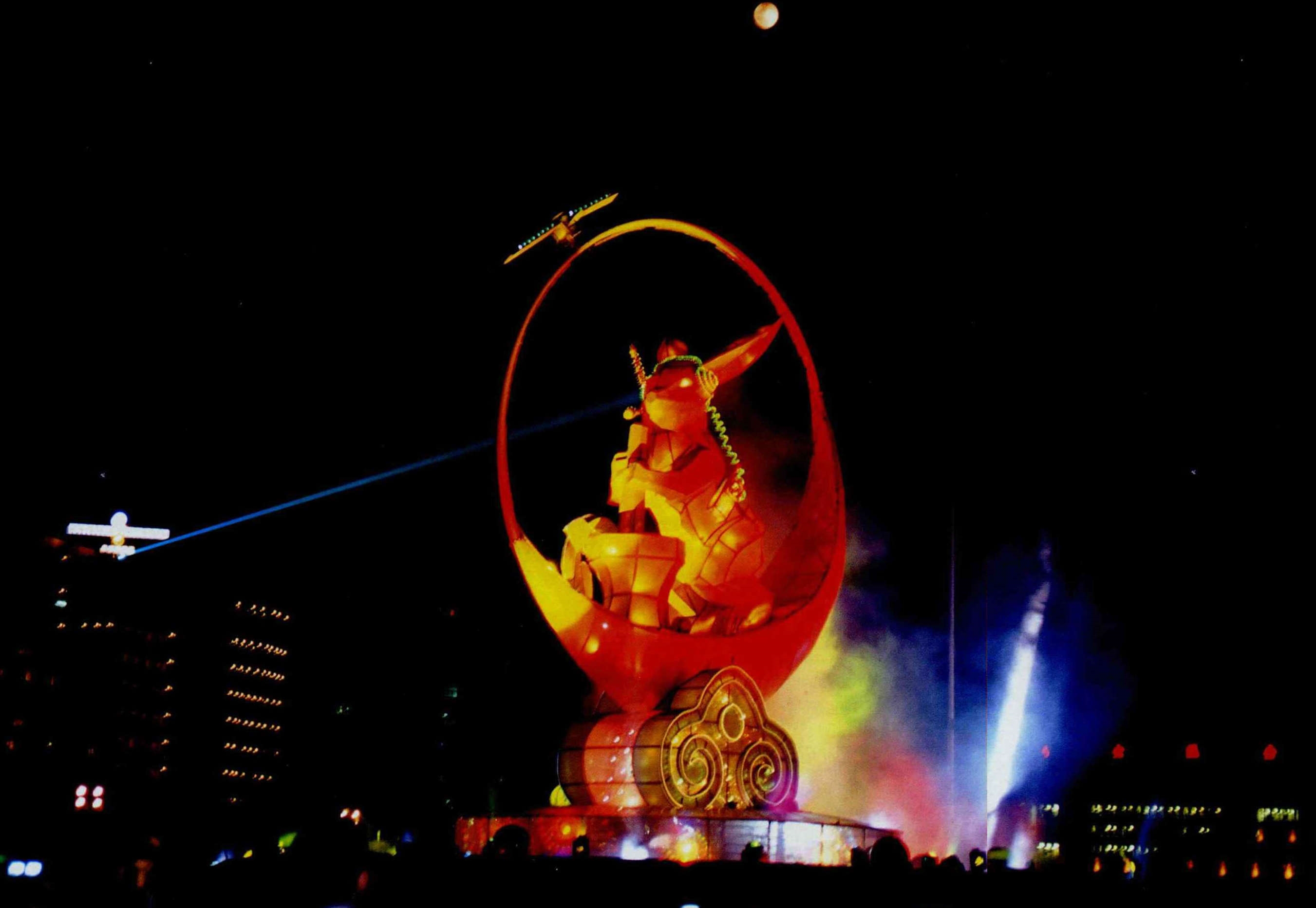 A mobile phone slung at his waist, headphones on his head, the Jade Rabbit grinds his medicines and chats with Chang-e in her distant lunar palace. The cellular phone craze has reached the point where even the centerpiece of this year's Taipei Lantern Festival was wearing one.