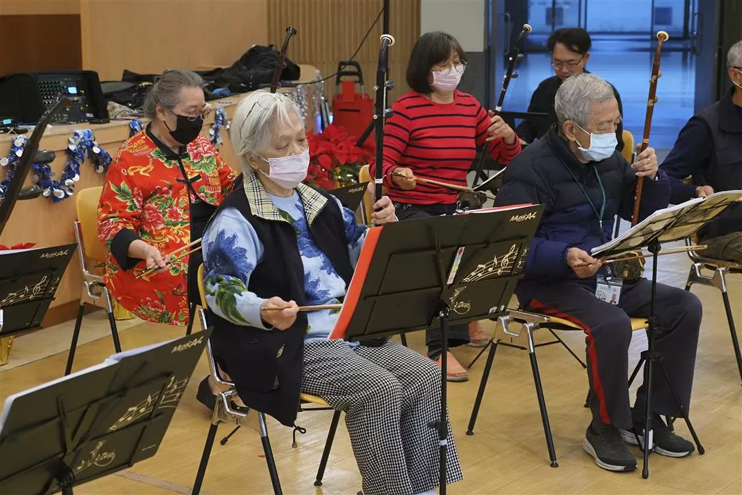 Health and Culture Village residents learning to play the erhu (a two-stringed Chinese fiddle). (photo by Jimmy Lin)