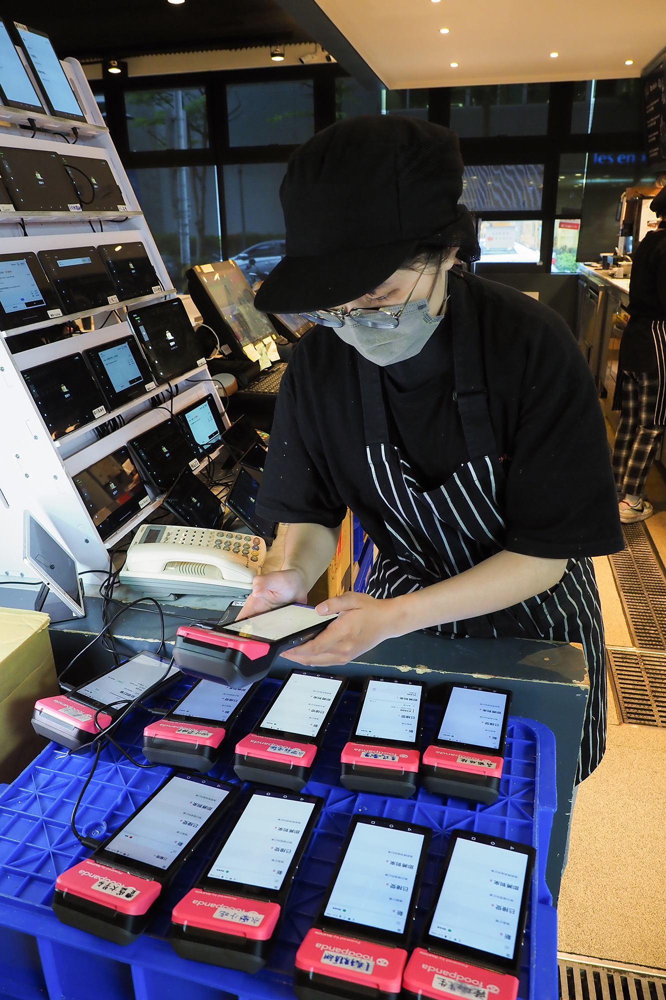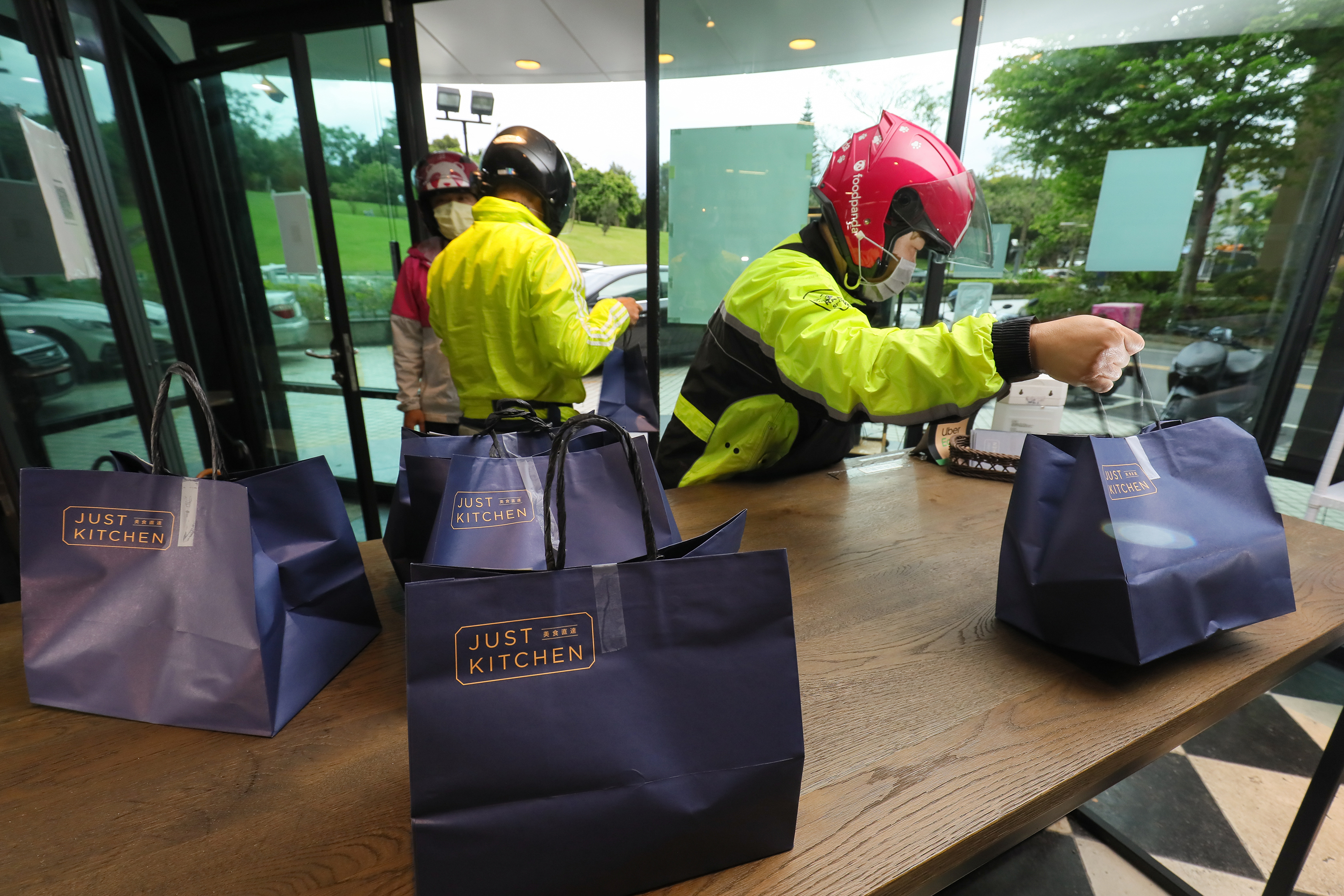 At peak dining hours, a steady stream of couriers passes through a cloud kitchen collecting orders for delivery. (photo by Jimmy Lin)