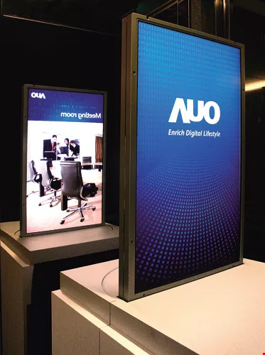 AUO's new 42-inch double-sided electronic notice-board uses AMVA (AUO Advanced MVA) super-wide-angle display technology. The two sides use the same backlighting module, and the entire unit is only 6 cm thick. It can display different content simultaneously, greatly reducing notice-board area and boosting the effectiveness of corporate advertising.