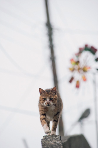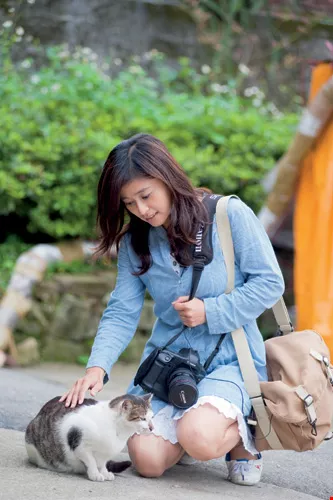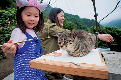 Now a professional photographer, she first flags down the stationmaster to discuss a pet product company's proposal to put up public hygiene information on the walls by the tracks. After that she threads her way past the pinwheels festooned on the bridge that is the only entry into Houdong's Guangfu Borough. Guangfu is suffused with charming little signs saying things like: "It is not advisable to bring dogs," "Please, no flash photography," and "Warning: now entering cat territory." Also scattered throughout are the delicate little wooden houses where the cats take refuge from the moist chill of winter.