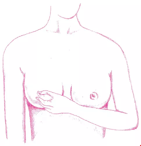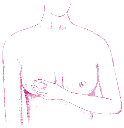 Touch: Place one hand behind your head and press your breast lightly with the pads of the three middle fingers of the other hand. Move your fingers in a clockwise spiral from the nipple to the outside of the breast.