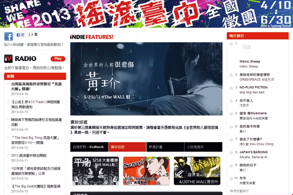 As for major musical events, iNDIEVOX has worked with StreetVoice since 2012 to produce live concerts for TV, recording over 40 popular indie band performances. Starting in April, concerts are scheduled to be aired on the cable TV show The Next Big Thing; this should drive the wave to greater heights.
