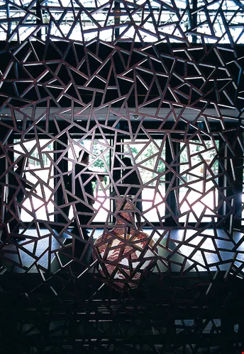 Behind the glass is latticework designed to look like the crackled glaze of Song-Dynasty Ru ware porcelain. The turquoise glaze of Ru ware, which crackled during firing, has been compared to the color of the sky peeking through clouds after rain. Yao used the crackled glaze as a theme for the walls, the main entryway, and the screens between tables, giving Silks Palace a rich, Chinese feel.