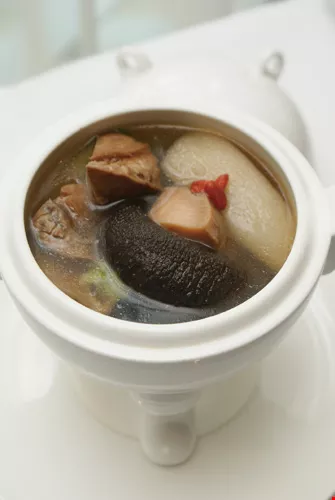 The second dish, the Minnanese "Buddha Jumps the Wall," is served in a tureen patterned after a Warring-States-era grain tripod with two handles. Silks Palace used a delicately glazed porcelain rather than the rough bronze of the original. The tureen has the impressive look of the ancient tripod, but it is not easy to hold and more than 20 have been broken while being served. It was a big problem for the waiters, who had to be trained in placing it on the table steadily.