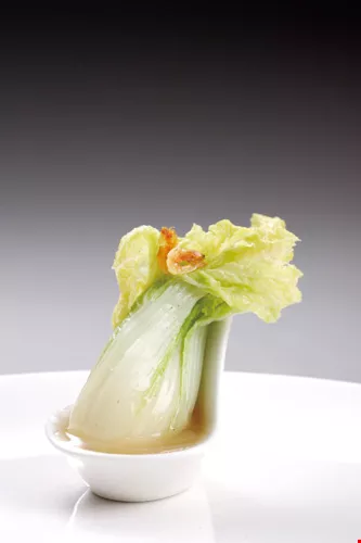 The first course in the National Treasure banquet menu is a real version of that mouthwatering Jadeite Cabbage-baby bok choy specially selected from Changhua with two sergestid shrimp from Pingtung's Tungkang on top to resemble the katydid and locust on the jade piece. So much like a work of art that it's almost a shame to eat, it is also tricky to make. It cannot be overcooked, or it won't be able to stand upright. There is craft in the small ladle-shaped dish that holds it up, as well. It was designed after a Han-era washing utensil called an yi.