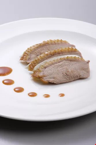 There are other special dishes, such as the "Yunlin Goose" described by Yuan-Dynasty artist Ni Zan. This famous traditional dish is said to have originated when, to thank Ni Zan for designing Suzhou's Puti Zhengzong Temple, Master Tianru of the temple had a chef specially prepare for Ni a goose with honey, salt, and onion pepper and then steam it with alcohol and chicken broth. Bright and aromatic, the crisp and tender boneless goose meat has a hint of chicken. The Hangzhou poet and gourmand Yuan Mei recorded its recipe in his work The Sui Garden Menu and praised the labor-intensive dish.