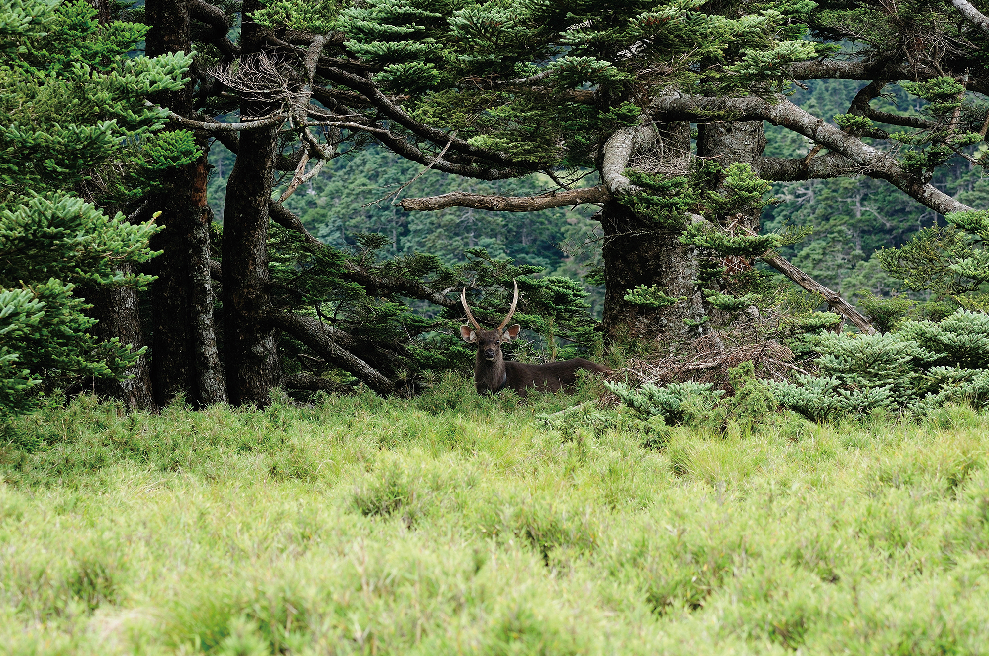 The Formosan sambar prefers a habitat that includes coniferous forests and Yushania bamboo grasslands.