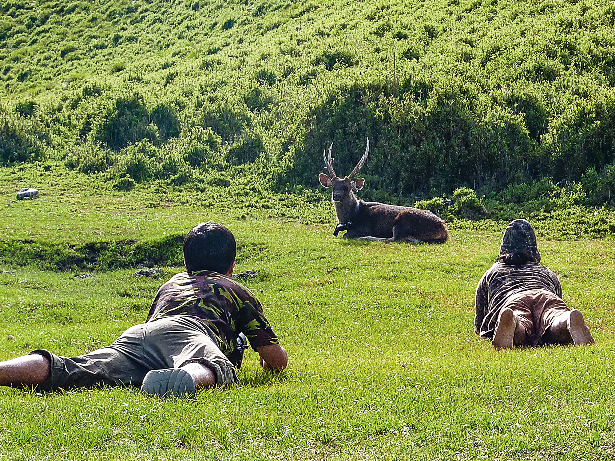 Yen Shih-ching, a postdoctoral fellow in the Department of Animal Science and Technology at National Taiwan University, recalls his first experience capturing a sambar. Lugging two nets, each weighing nearly 20 kilograms, the research team, with two Aboriginal hunters as guides, climbed into the mountains. On the first day it rained, and carrying the wet gear alone was exhausting. After two days of hiking, they reached the western peak of Mt. Panshi and set up camp in a spot called “Exclamation Pond,” a small valley-shaped depression that resembles an exclamation mark when the water level is low. After setting the nets, all the men in the party had to urinate on them, because human urine attracts the sambar.
