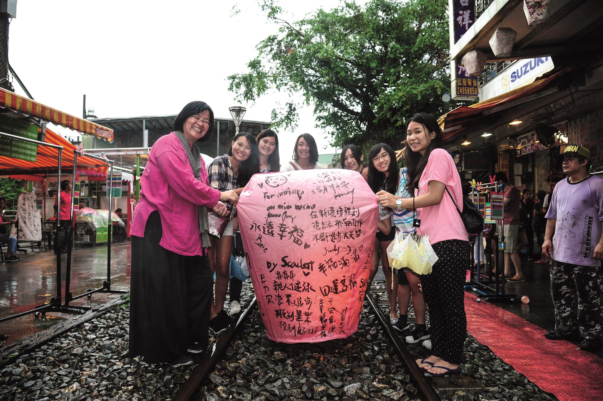 Christie Chang (left), resident director of CIEE’s Taipei Center, goes to Pingxi with students to fly sky lanterns. They inscribe wishes and blessings on the lanterns in Chinese characters.