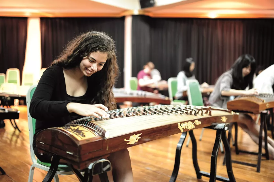 Students with no experience on the gu zheng (traditional Chinese zither) are keen to try their hand strumming the strings in a music lesson.