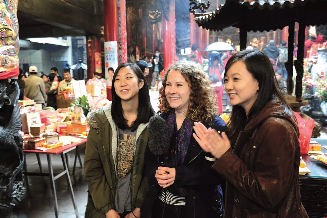 Students from Europe, America, Japan and South Korea visit a Taiwanese folk temple to experience the local atmosphere.