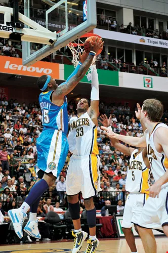At the invitation of Bros Sports Marketing, the NBA scheduled its first-ever Taipei preseason game. It was Taiwan's biggest sporting event of 2009. In the photo, Carmelo Anthony (left) of the Denver Nuggets and Danny Granger of the Indiana Pacers battle for a rebound.