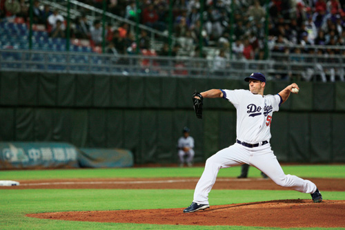 It took 17 years to bring the Dodgers back to Taiwan. The photo shows pitcher Eric Stults, who started the Taipei game.