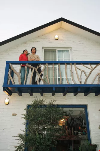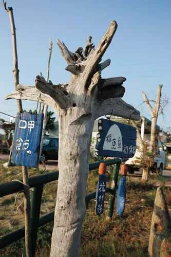 Perched on the pond's edge, the blue-on-white lodge has an ocean theme. The walls of each cabin are adorned with pictures of colorful fish and seaweed and intriguing clamshell windchimes dangle from the eaves. All tables, chairs, lighting fixtures, cup stands, the handrails on the stairs, and even the key rings for the guest rooms are made of driftwood found on the beach by "A-Wang" and his family. It's not uncommon to see guests riveted in place as they study the ingeniously crafted pieces.
