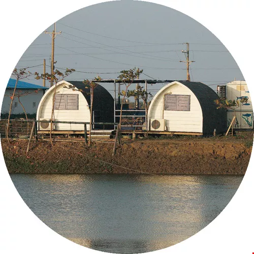 The semi-cylindrical waterside lookouts are where laborers used to stay at night years ago when watching over milkfish farms. Today, they are cabins very popular with Dorigo's guests.