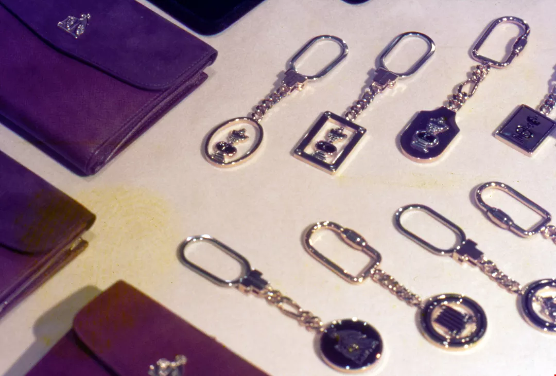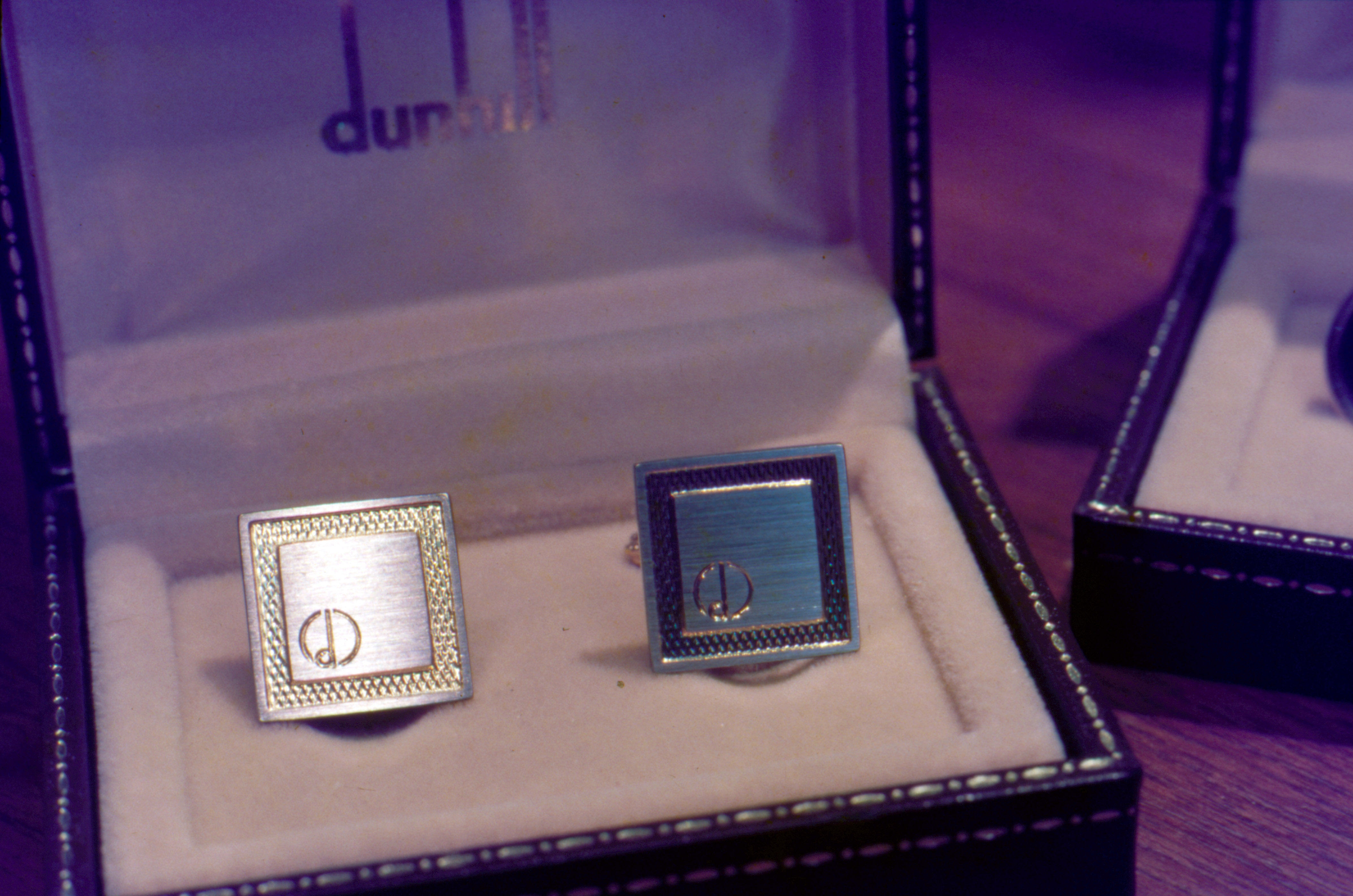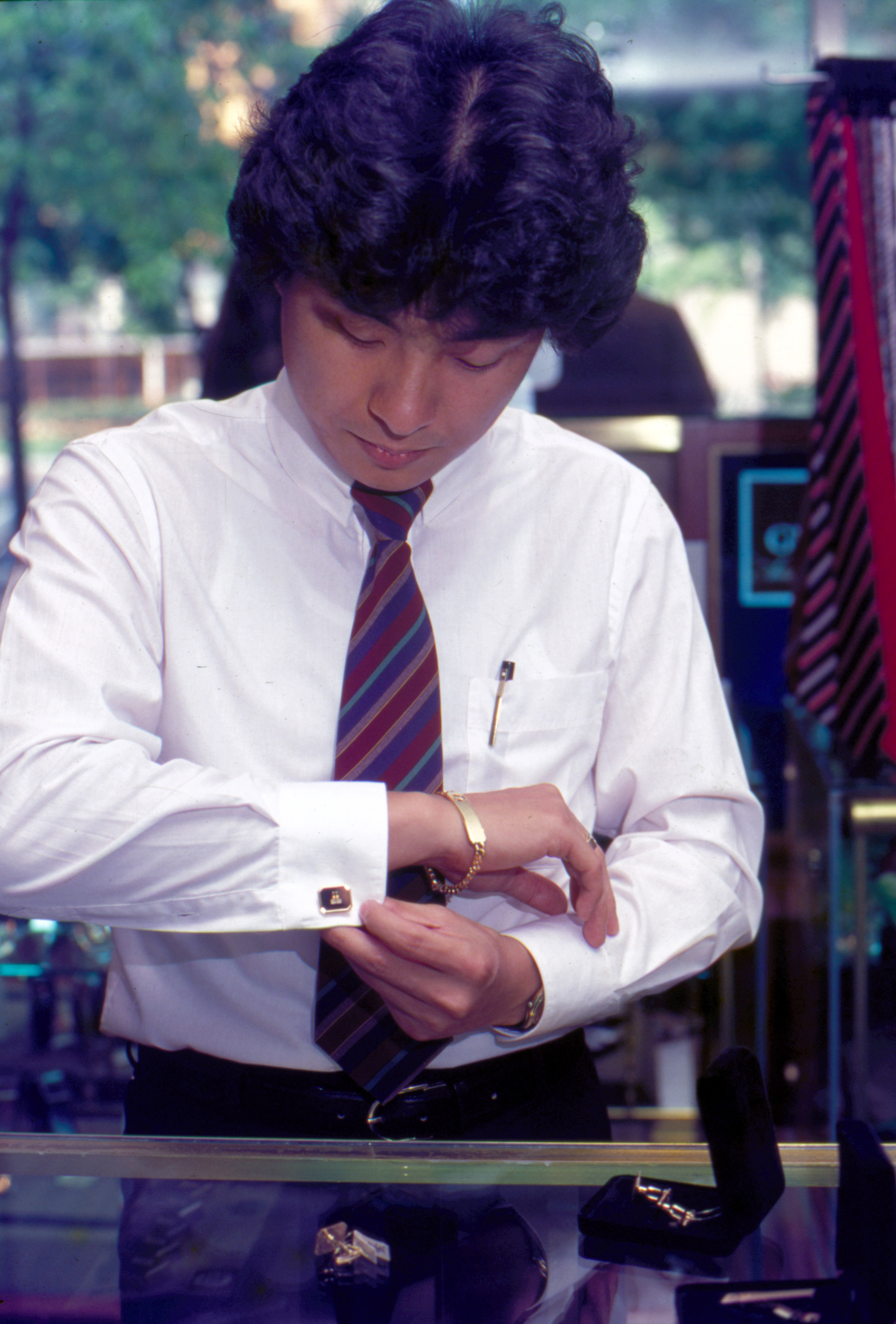 The Milan Men's shop at the Howard Plaza Hotel sells a wide assortment of designer labels. 1,2. Examples of the English company, Dunhill. 3,4. A customer tries some cufflinks and then makes a tie selection.