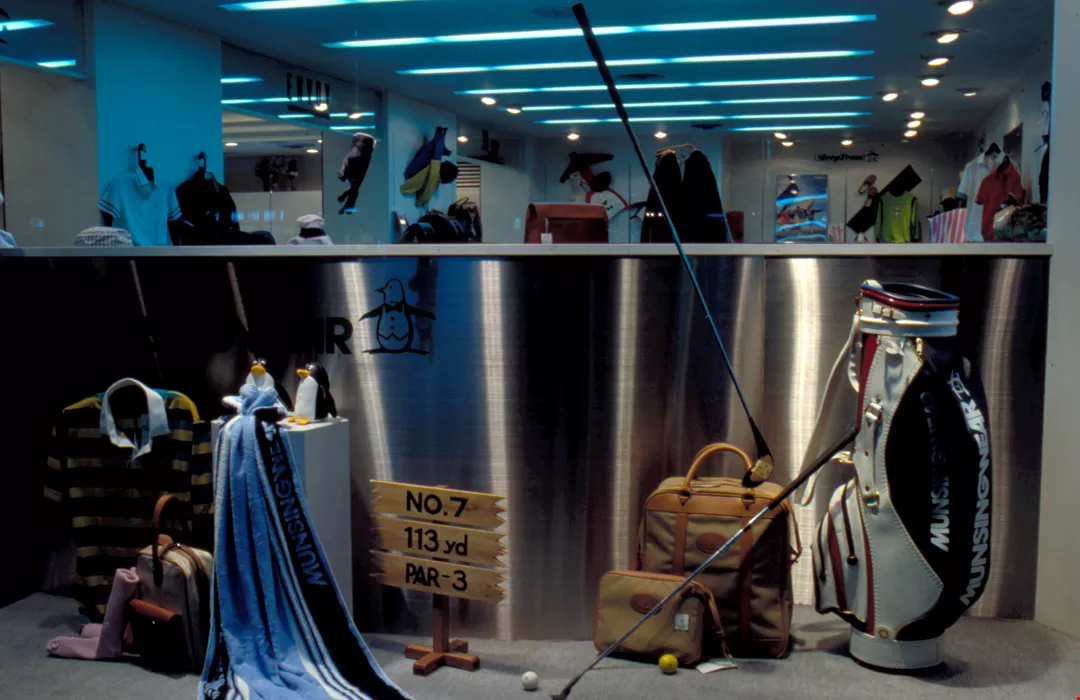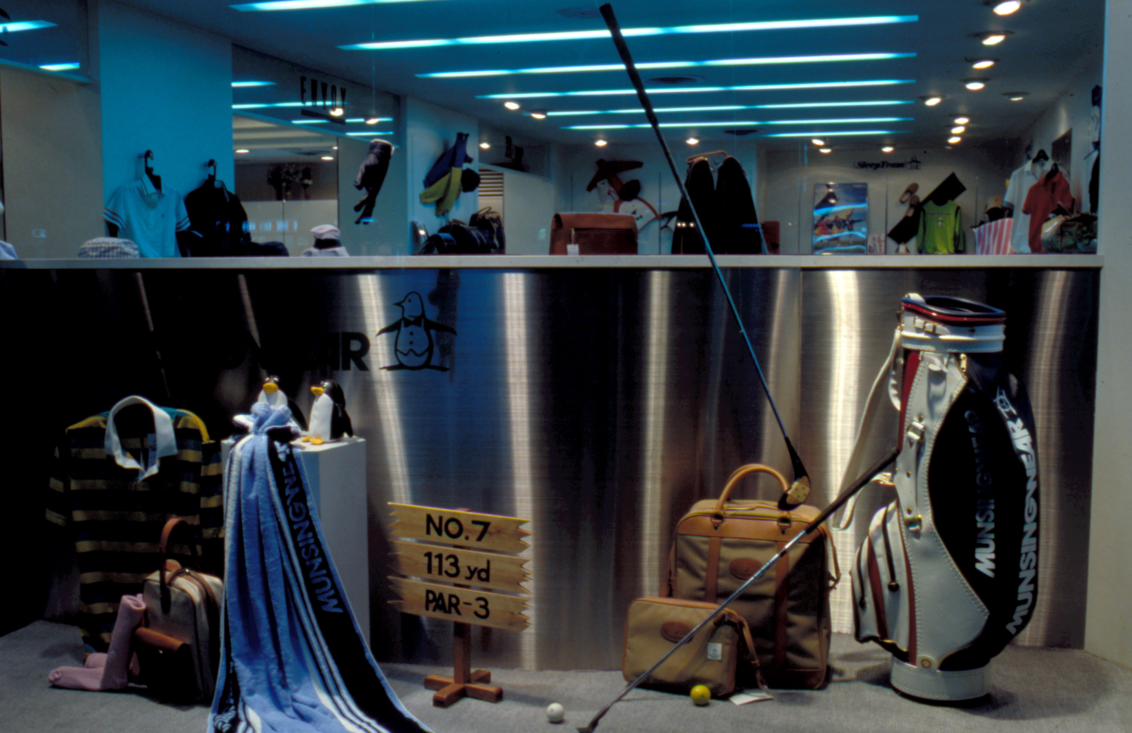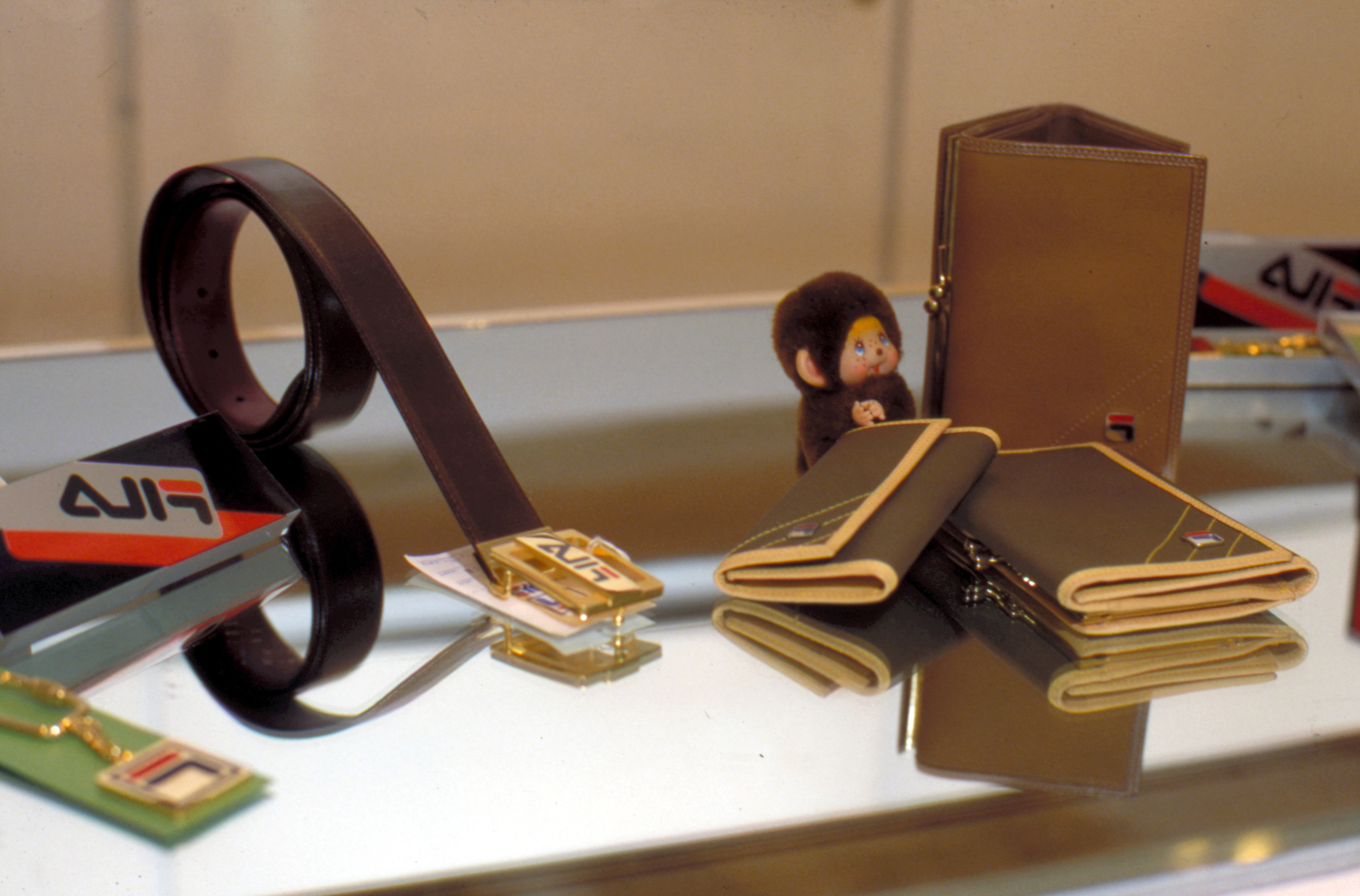 1. Goods such as wallets, belts and keychains bearing the label of the Italian company, Fila, enjoy great popularity locally. 2,3. Munsing-wear's specialty shops sell top quality golf apparel and equipment: 2. some of the many different styles of the company's leisure wear, 3. a complete set of golf clothes and playing equipment on display in a show window reveals the special qualities of this company's products.