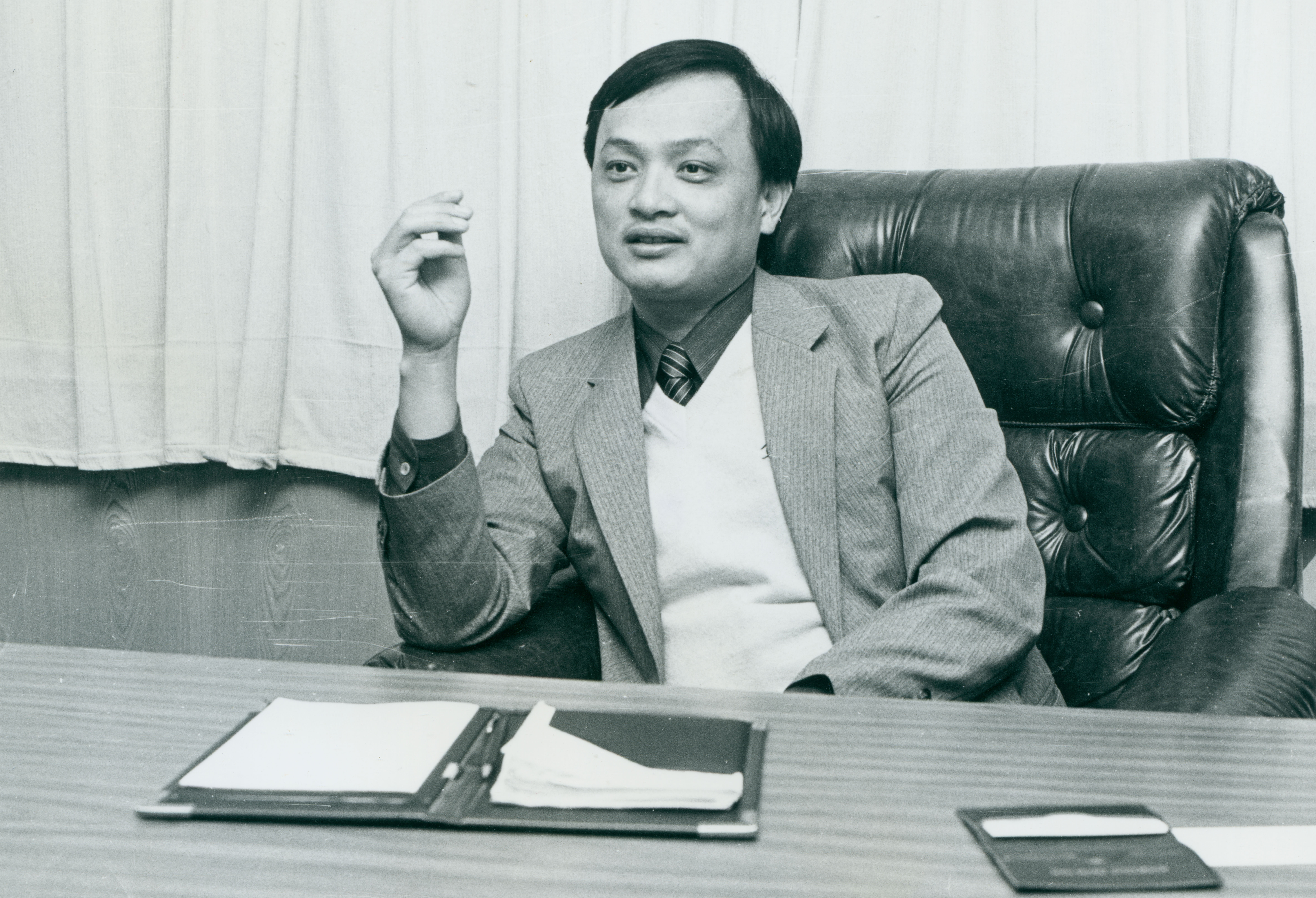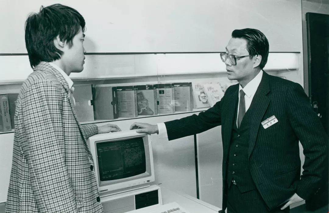 2. Shih Chen-jung (right), general manager of Sertek International Incorporated is seen explaining the many functions of the company's newest "fourth generation of Chinese computers.".