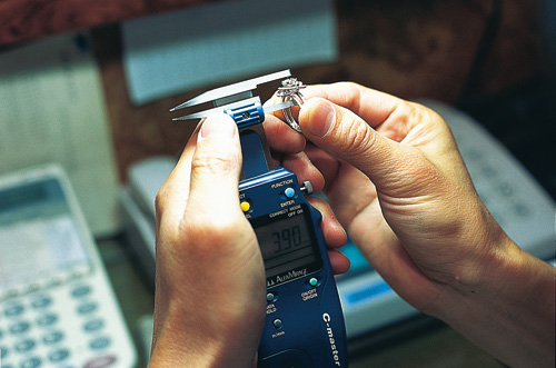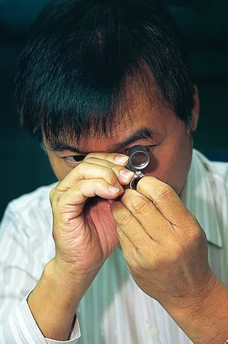 Assessing the value of the proffered collateral is an essential part of the pawn transaction, and a mistake in judgment can cost a pawnbroker dearly. The photos show a pawnbroker evaluating the size and color of diamonds, and judging the authenticity of a watch.