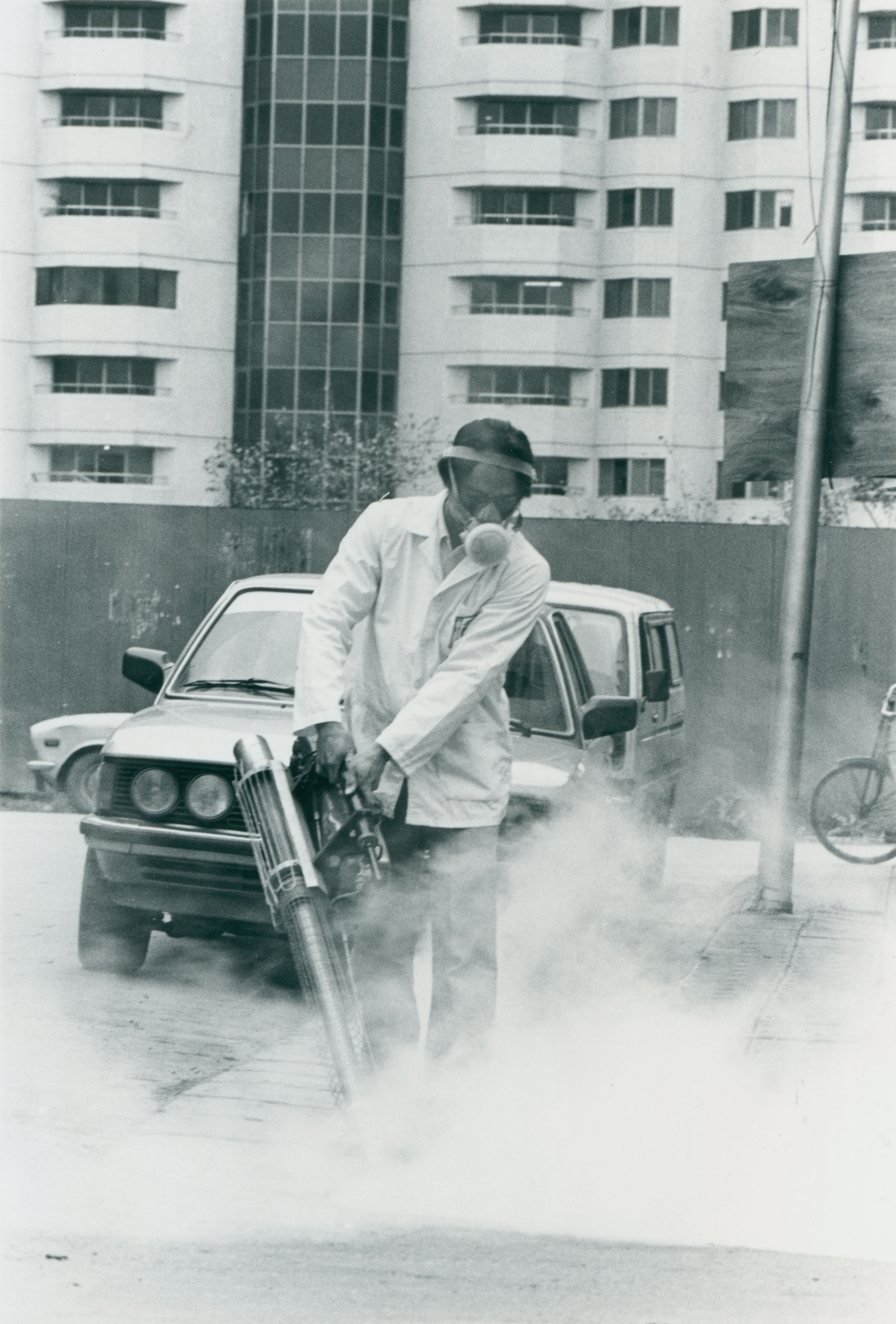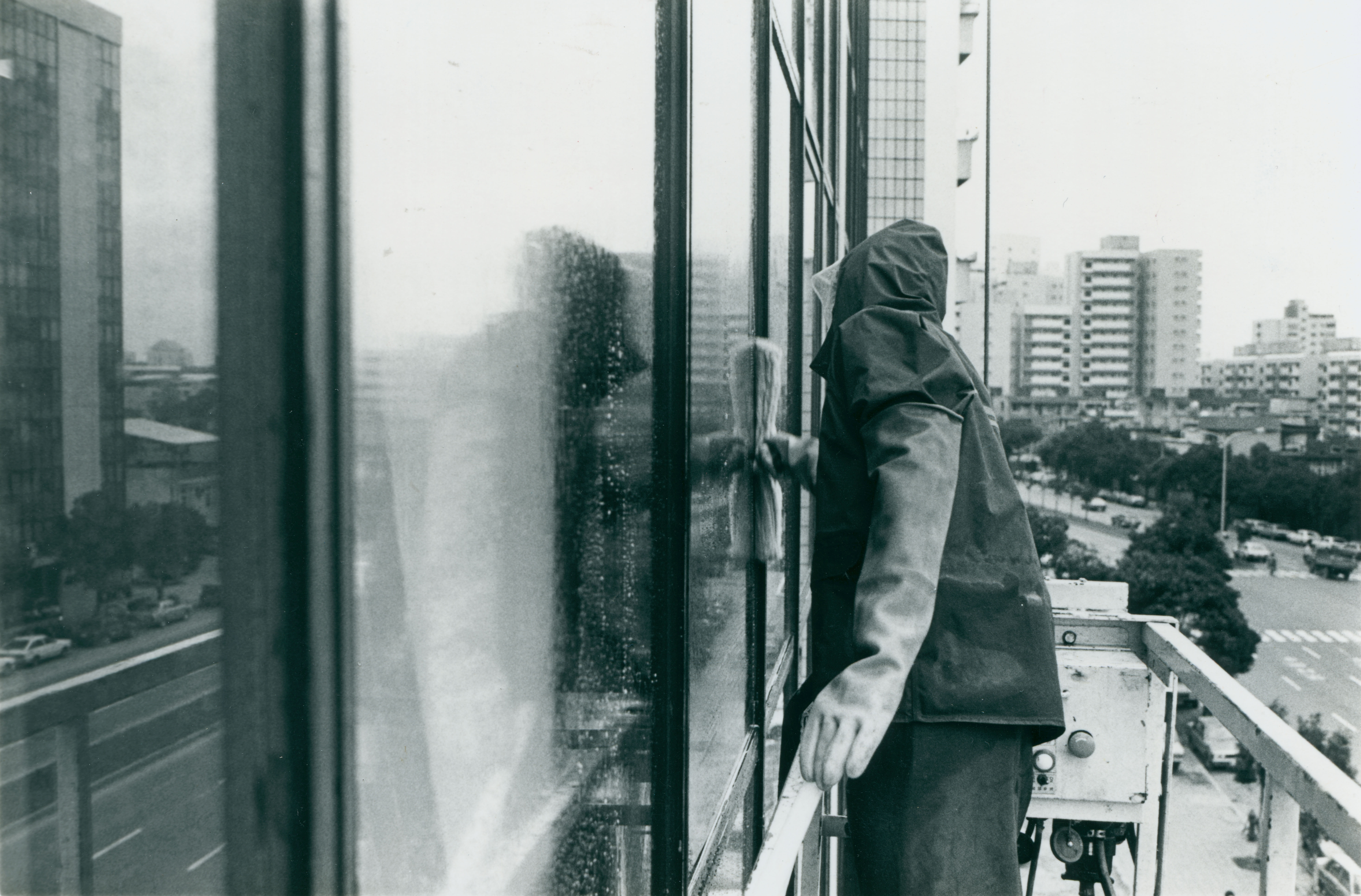 In recent years Taipei's urban facade has assumed the air of a modern, thriving metropolis. Streets are crowded with glistening glass office and apartment towers, testament to the economic miracle of the Republic of China. Like any large urban center, the skyline of Taipei suffers from winter rains, wind and the accumulation of dirt that is typical of the urban atmosphere. In order to restore these glass edifices to their former glory, professional cleaners are called in to perform their beautifying services. Today it is not uncommon to see suspension scaffolding complete with technicians washing and cleaning these tower complexes. Chao Shih, head of the Chieh Hsing Incorporated Company says that there are two standard methods for cleaning office towers. They are water wash and dry wash methods. The water wash is a simple procedure whereby a detergent is applied to the glass and then water hoses are used to rinse it off. The only problem created by this method is that the water rinse splashes onto the sidewalks below creating a great deal of inconvenience for pedestrians. The dry wash involves special cleansing agents which are removed by either a cloth or blade-like brush. This method doesn't involve much inconvenience to pedestrians but has not won the favor of building managers as it costs nearly three times as much as the water wash.