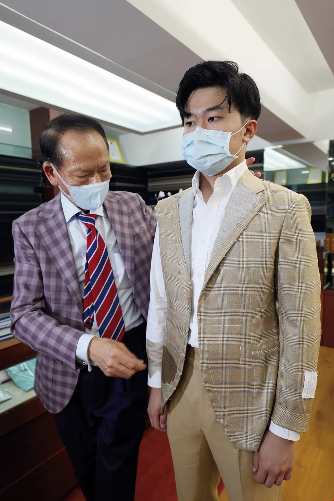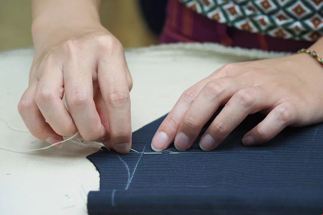“Baste fitting” is a critical step in the process of making a bespoke suit. Experienced master tailors can then make adjustments based on the customer’s body shape.