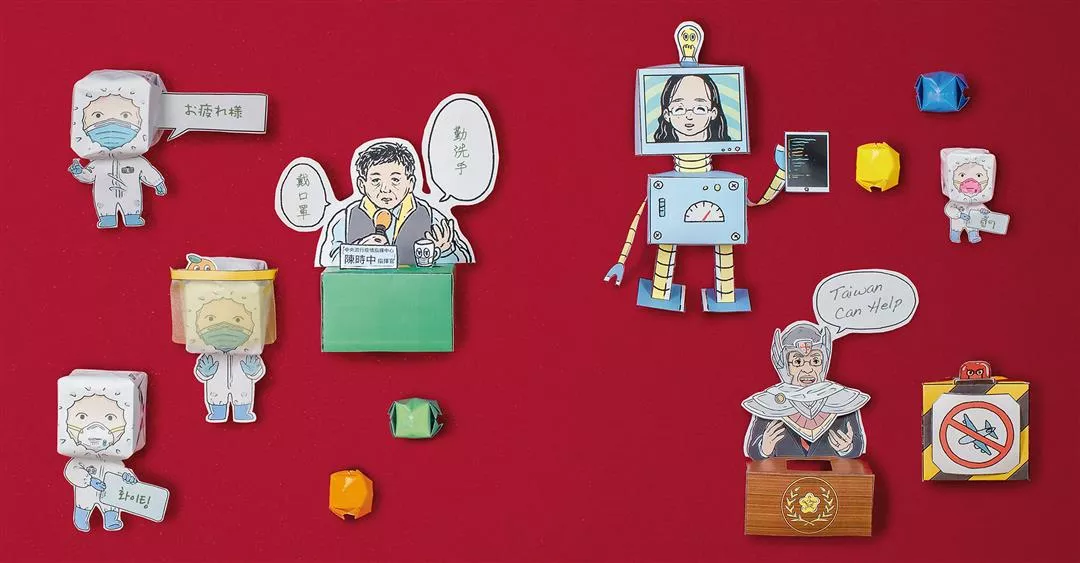 Keeping an eye on the daily 2 p.m. press conferences and wanting to do some non-project-related drawing in her free time, Hsu found herself frequently sketching the cultured-looking minister of health and welfare. She included a face-mask-wearing coffee mug on his desk, and then designed her sketch to work as a 3D pop-up and added a speech bubble. “The speech bubble was crucial because it let everyone add their own thoughts.” Hsu made copies of the drawing, then cut and folded them into shape to create 3D versions of Minister Chen. She was surprised by the enthusiastic response to the figures when she posted them online and opened “classes” at her “Yi Tonn Covid Prevention Arts and Crafts Studio.”