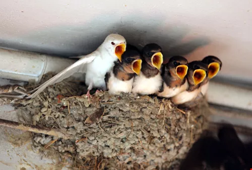 “Feed me! Feed me!” The baby swallow on the far left exhibits albinism, which also affects some humans.