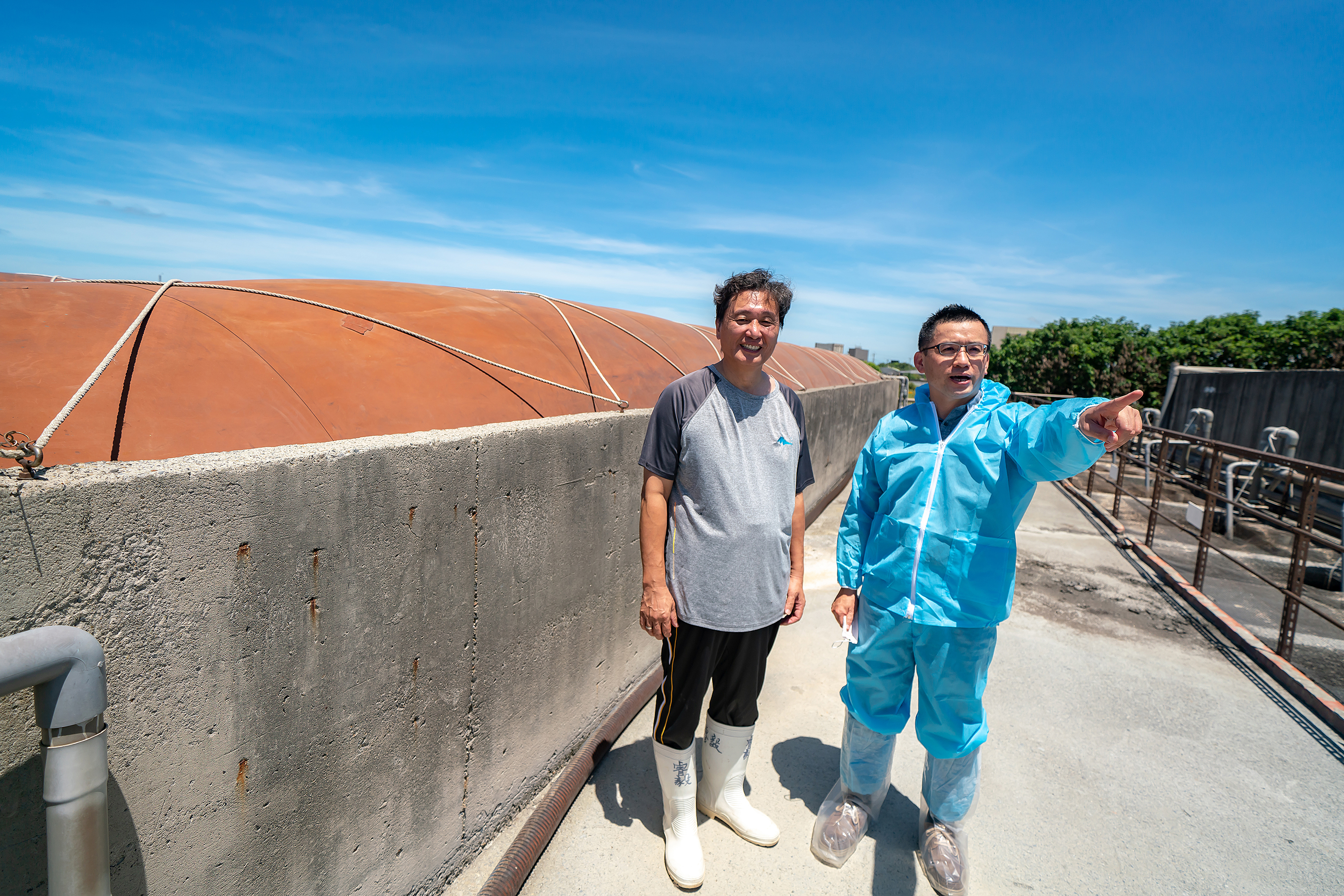Li Chih-chieh (right), manager of the Agricultural Energy Technology Development Department at ITRI’s Central Region Campus, and Martin Lin (left), director of Longsheng Livestock Farm, have been working together to solve the wastewater treatment problems faced by traditional livestock farms.
