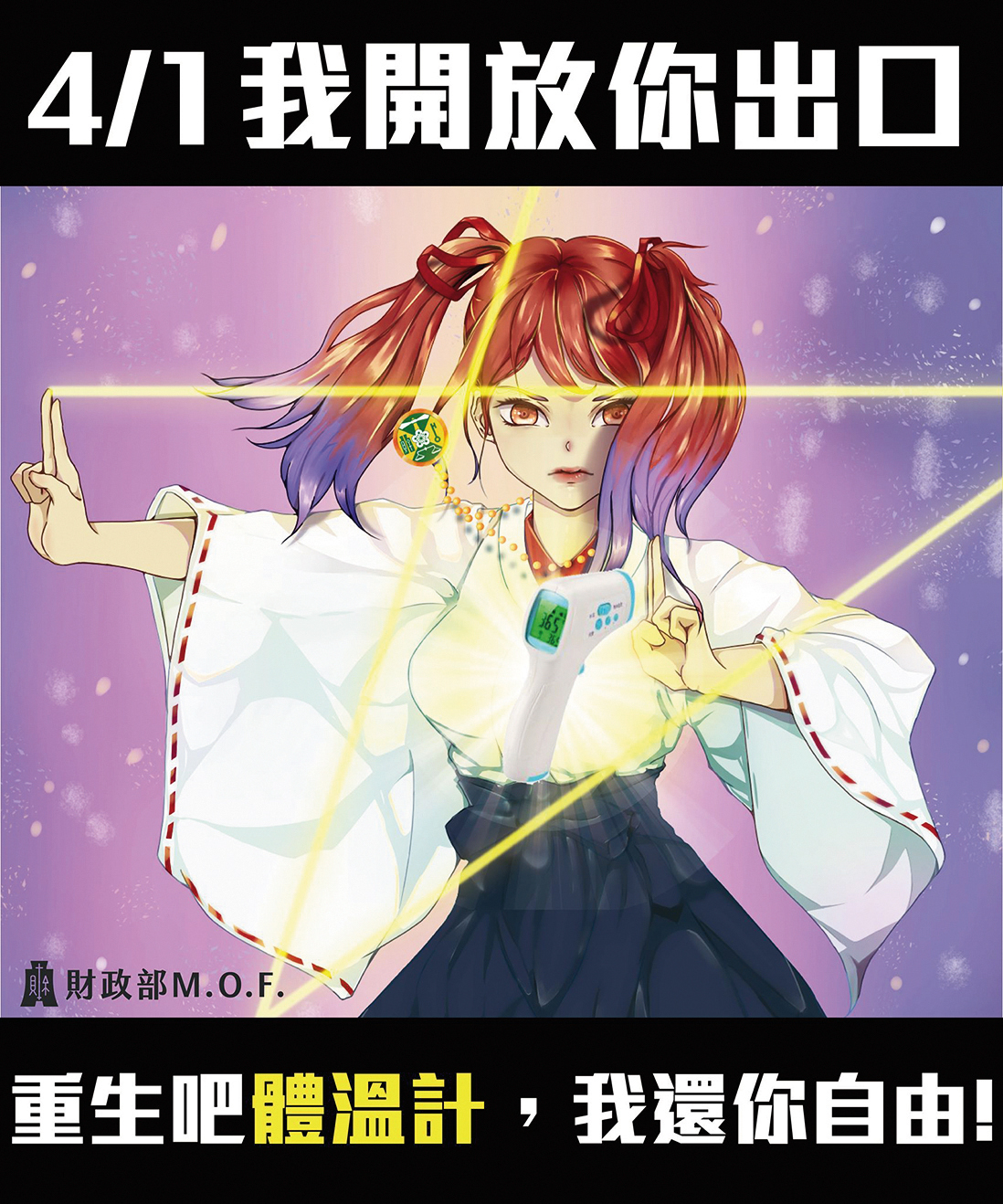 “I allow you to be exported! Come back to life, thermometers! I command you, cast off your restrictions! Your bonds are broken!” Exports of digital thermometers were temporarily banned earlier this year because of Covid-19. To publicize the lifting of this ban in April, social media editor Lu Chia-wen of the Ministry of Finance adapted a magic spell from Zenki, a Japanese manga series familiar to people in their 30s and 40s. Her post was viewed by more than 620,000 people.
