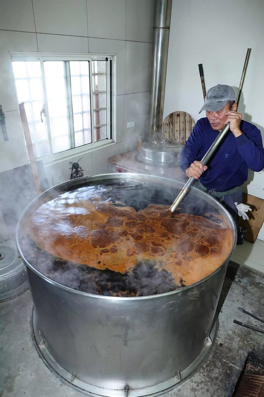 Entering the rural factory, a sweet fragrance floats in the air. Inside, brewed sauce is being heated in large stainless-steel stockpots over wood fires. Hsieh Yi-che and his father, Xie Yudu, prefer wood fire to high-efficiency gas burners for two reasons: Firstly, it lowers costs. Secondly, the longer cooking time improves the aroma of the soy sauce. However, master brewers must control the strength of the fire while at the same time continually stirring the sauce to avoid it burning on the bottom of the pot. Xie Yudu says that when the sauce reaches a full boil the fire must be reduced to a minimum level to avoid losing the aroma.
