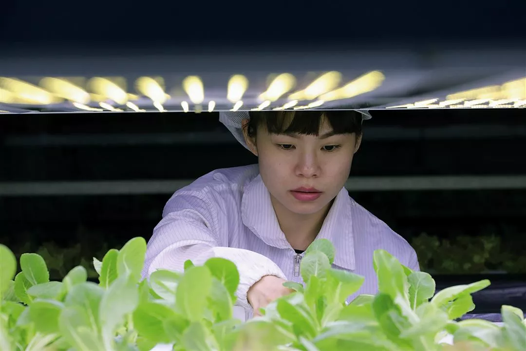 With 12-channel-spectrum LED lights, YesHealth creates artificial sunlight that allows the farm to grow vegetables out of season. (photo by Jimmy Lin)