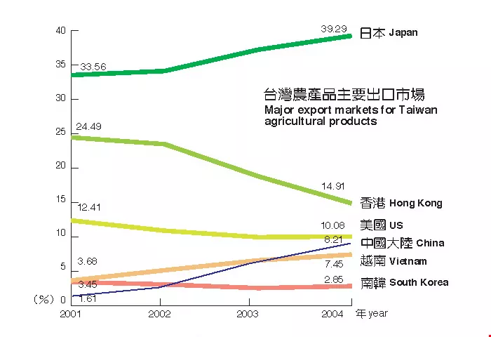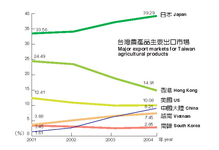 Many people who have traveled to Japan are amazed at the astronomical ¥10,000 a couple of musk melons can fetch at a supermarket, so it's no wonder that Japan, which can afford to eat expensive fruit, has been the number-one choice as a target for Taiwan agricultural produce. COA statistics show that in 2003 the value of Taiwan agricultural products shipped to Japan was US$1.2 billion, which represented 37% of total agricultural exports. Last year it grew slowly to US$1.396 billion to reach 39% of all agricultural exports.