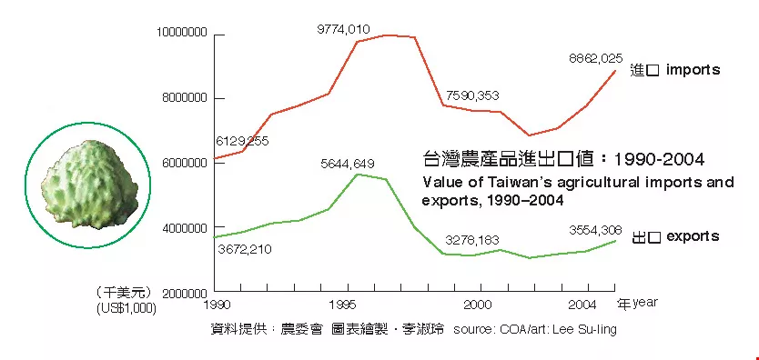 Value of Taiwan's agricultural imports and exports,1990-2004