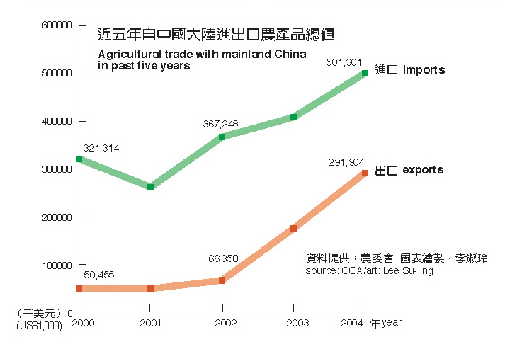 The government has a cautious wait-and-see polity on moving Taiwan agricultural products into the mainland market. Huang Tzu-bin says that sales of agricultural products to mainland China constitute 8% of Taiwan's total production value. With the 15% represented by export sales to Hong Kong added in, this means that already one fourth of all agricultural products depend on the Chinese market. If, just because mainland China makes a big show of being nice, the main battlefield for the export of agricultural products is unceremoniously shifted to China, and expansion in the US, Japan and other important markets is neglected, then some day when China suddenly pulls the plug we will have to face the bitter consequences of an imbalance between production and sales.