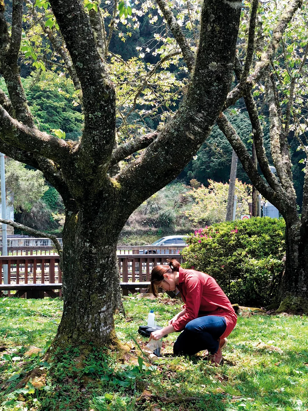 The soil around this cherry tree on Alishan (Mt. Ali) has become compacted, so that it is unable to absorb sufficient nutrients, and in recent years its root system has withered. Jan performs a soil analysis with a view to improving the tree’s nutrient uptake.
