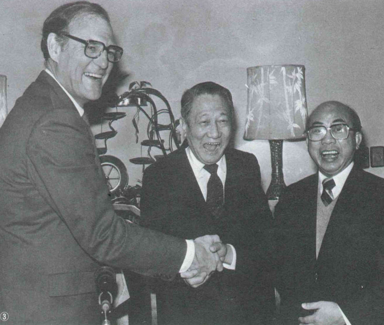 Facing. After signing a cooperation agreement, H&Q Corporation's President William Hamberecht(l.) shakes hands with the Ministry of Economy's Vice Minister Wu Mei-ts'un(m.) and the Chairman of the Board of Chin Fong, Shi H. Huang M.D.(r.).