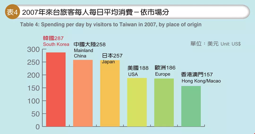 Table 4: Spending per day by visitors to Taiwan in 2007, by place of origin