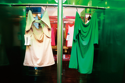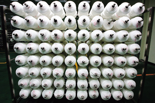 "All of our knitting machines have their own 'private room,'" says Henry Chen, operations manager at Eclat Fabrics Ltd. (Vietnam), as he takes reporters on a tour of the US$40 million plant that does everything from knitting to dyeing and finishing. In the six-meter high space, machines from famous makers in Germany and Japan are set in rooms separated by transparent barriers. On the left- and right-hand walls of each room are each hung 48 spools of yarn, while spools of elastic yarn are hung in a circle around the machine itself-whose shape calls to mind a flying saucer-which is located in the center of the room. Strands from the three locations (the two walls and the circle of elastic yarn spools) are continually woven into a long sheet of "gray fabric" (undyed cloth is generally called "gray").