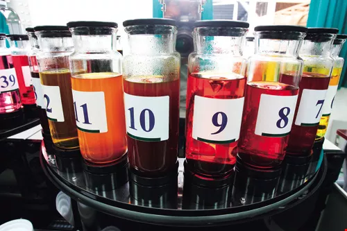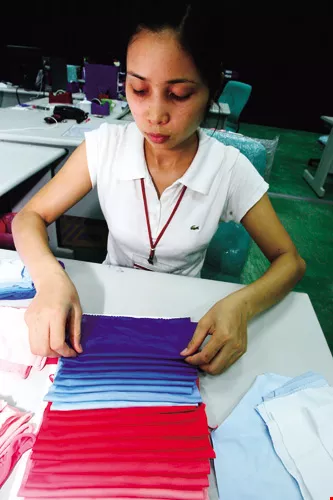 In response to the different water quality in Vietnam, Eclat has had to construct from scratch a new dyeing database-an enormous undertaking. The photo shows a worker handling some sample cloth that makes up part of the database.