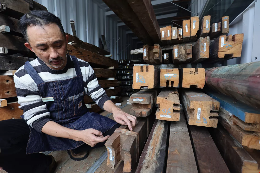 Chen gives us a tour of HAMV’s warehouse and tells us about the various materials. “We can take pretty much any building material from a structure, but wooden items have the highest level of reusability.” Outside, we see old China fir, Taiwan incense cedar, false cypress, and longan wood, all of which can be put to use as replacement structural members in future renovations. We also spy aluminum-alloy frames acquired from Taipei’s Songshan Tobacco Factory and dating from the US aid period, and onigawara (ogre-faced roof ornaments) of various sizes made by different manufacturers, all of which will be sorted before being sent out for reuse.