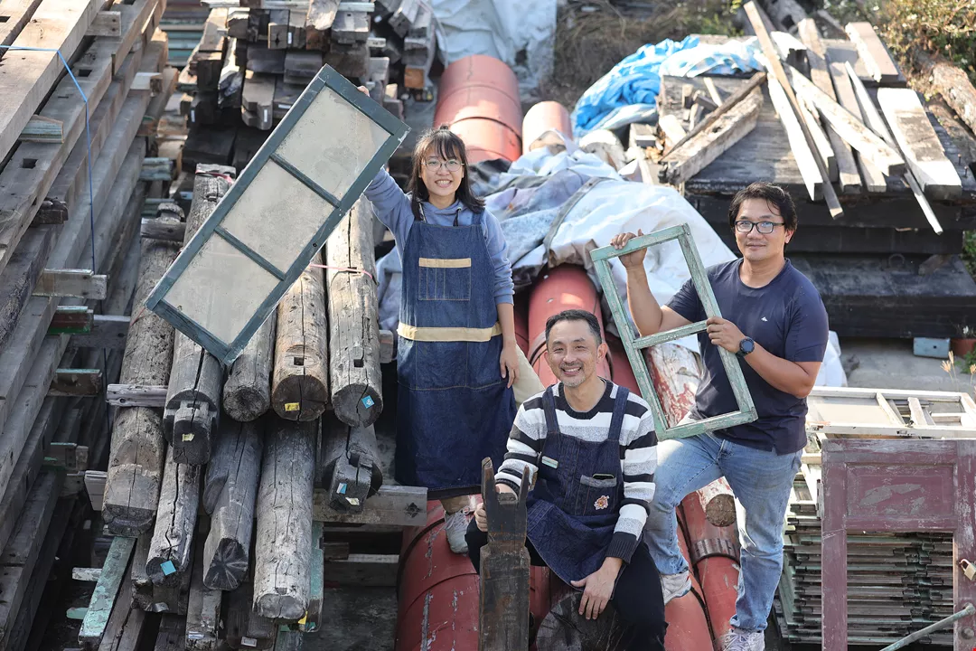 A lot of work goes into obtaining reusable building materials, and the process requires constant communication. For example, when the team learns that an old building is going to be torn down, it rushes to the site to inspect the structural timbers, and prioritizes collecting materials that can be reused, such as wooden flooring, doors, windows and roof tiles. Once heavy demolition equipment enters the site, the team befriends the workers by bringing them water and betel nuts, and then works with the backhoe drivers to suggest paths and angles of approach to the demolition in order to keep the reusable materials as intact as possible. Whatever the team salvages then has to be transported, cleaned, separated, organized and cataloged. The final step is bringing more people into the sustainability circle by making the community aware that materials are available and matching them with users.