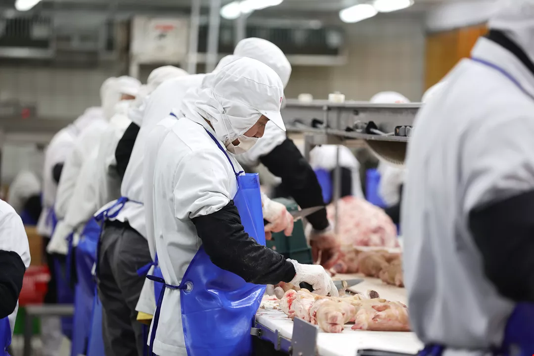 Taiwan’s pig slaughterhouses and pork processing businesses are keeping up with the times and getting in line with international standards. The photo shows the butchering area at Chaishan Foods Company.